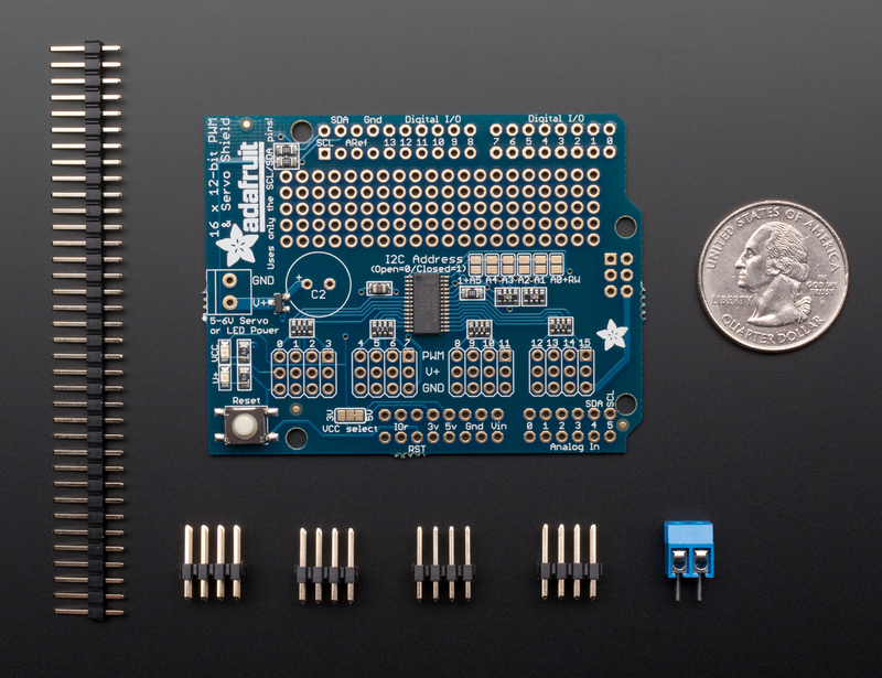 The shield comes with the typical non-stackable male headers to interface with the Arduino board, as well as four 3×4 male headers for connecting up to 16 servos, and a two pin terminal block to provide power for those servos.
