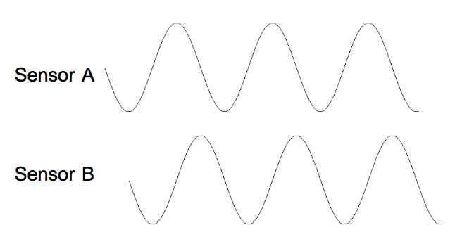 But most encoders will use two sensors and position them so their signals are close to 90° out of phase from each other as possible. If you look at the example signals above you will notice that the peaks and valleys of A and B are out of sync.