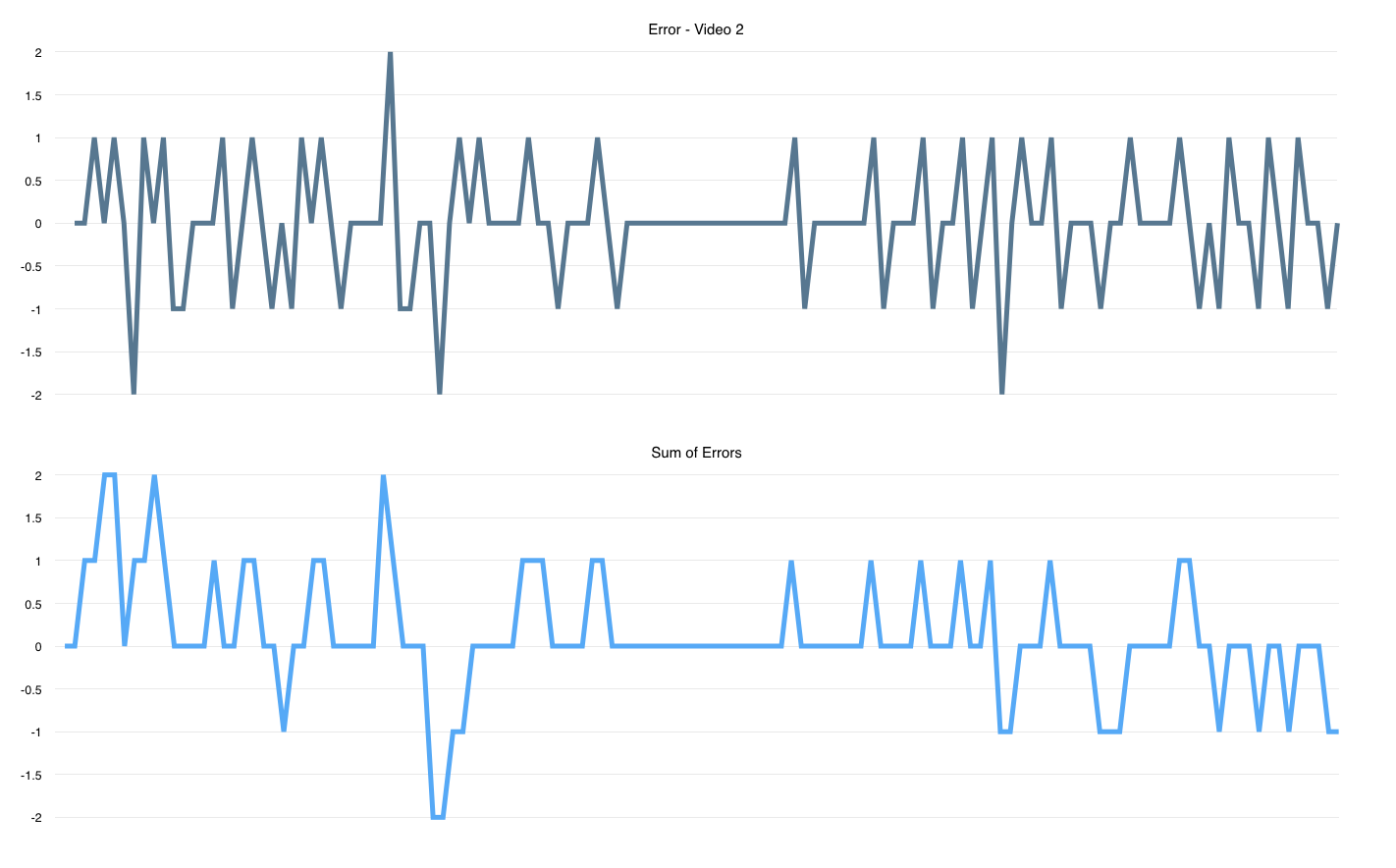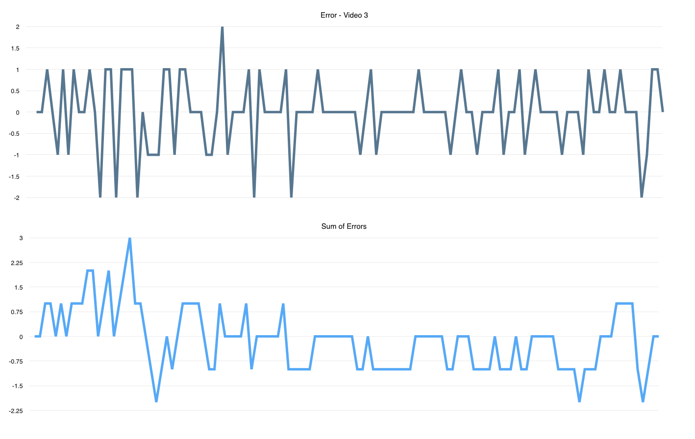 The data says it is going straight. The difference between left and right wheels never really gets above two ticks ( 2/48th of a revolution). However, the bot seems to be deviating quite a bit from straight. Mighty confusing.