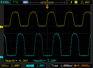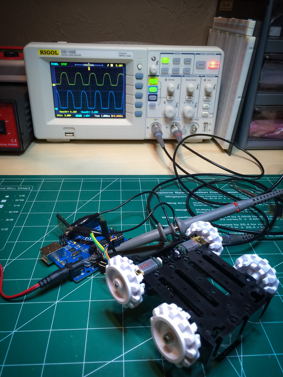 I jimmied up power for the encoders and motors, attach an oscilloscope and measured their wave forms as the motors turned: