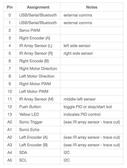 • Reflectance sensor array – assigned to A0, A2, A3, 4, 5 and 11 (6)