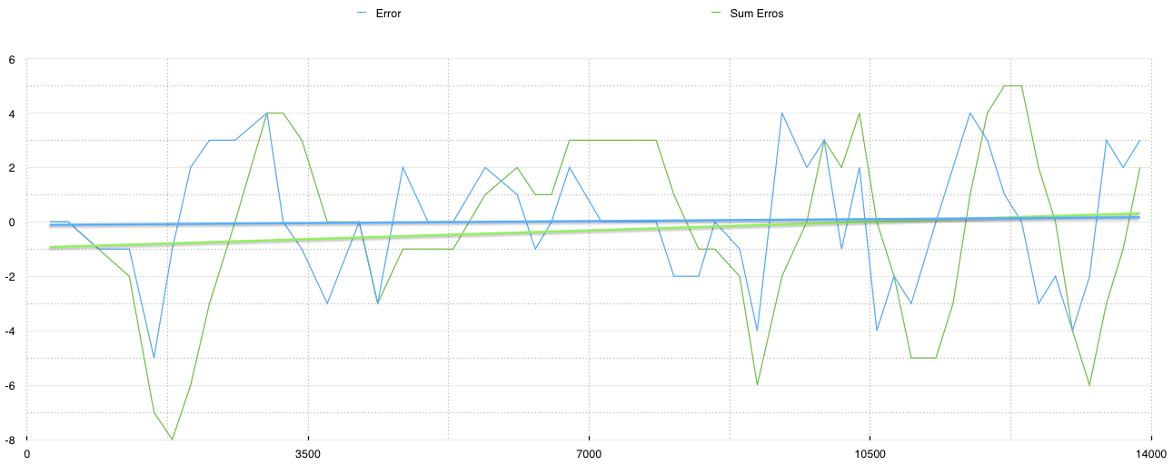 With the data I made a graph of the error between left and right wheels, i.e. the difference in their tick count (which should be zero for a straight line), as well as the total sum of errors over time. The x-axis is in milliseconds.