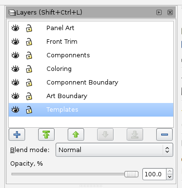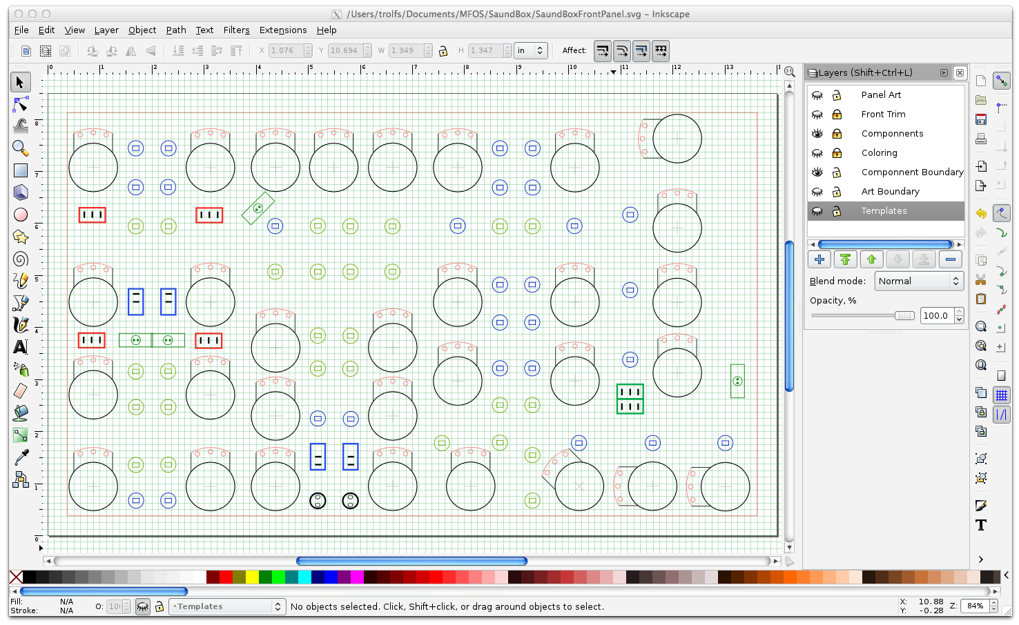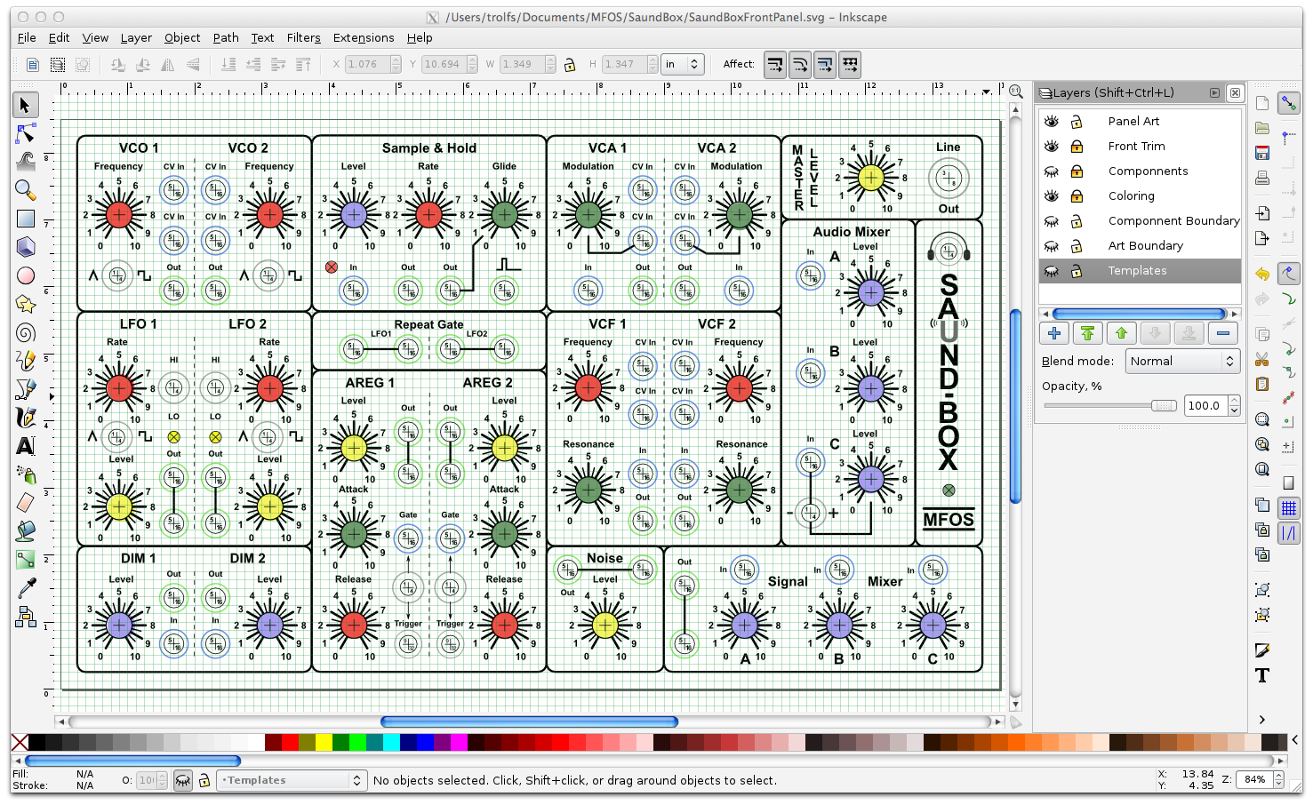 In the Templates layer I created and managed all the graphical elements needed for the panel. This broken down into three main areas: Panel artwork, components and front panel trim: