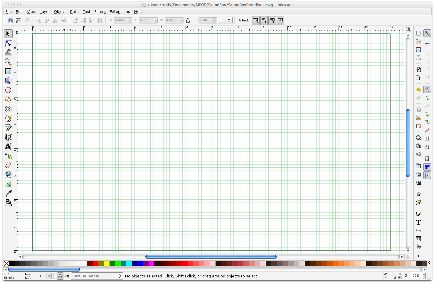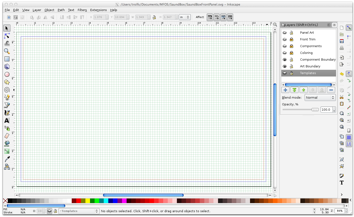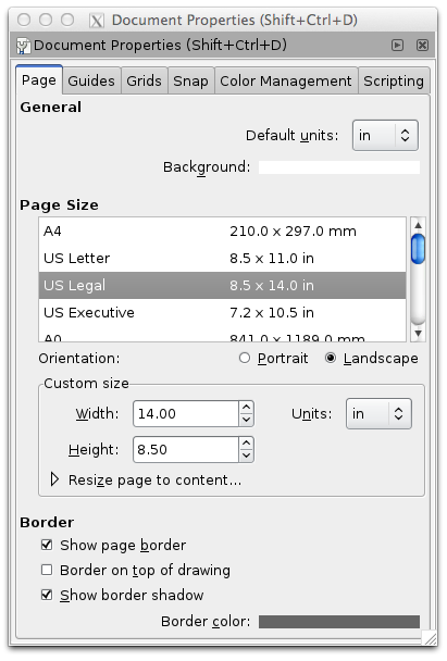 For this project I’m trying to fit the panel on to a legal size page (14″ x 8.5″) so I created a new Inkscape file with a legal page size in portrait orientation and using inches as the units: