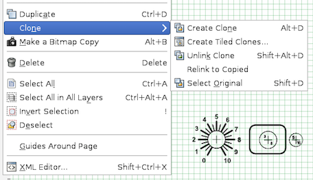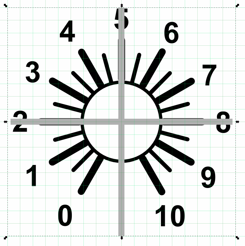 One of the big issues I had with Inkscape was its inability to specifying an anchor point for each graphical object. This was a problem for non symmetric objects like the dial markings and the potentiometer components as their bounded center points do not match with their placement center points (i.e. the crosshairs).