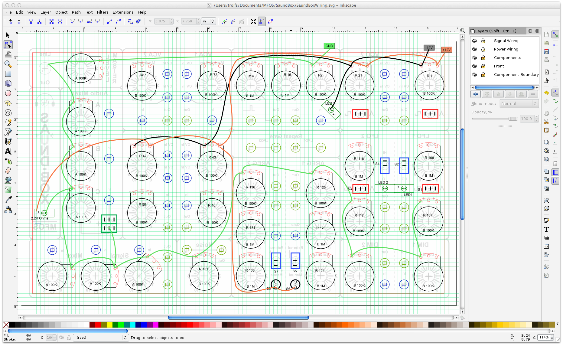 Once the main signal wiring diagram was complete I used the Power Wiring layer to figure out the best routing for the GND, +12V and -12V lines.