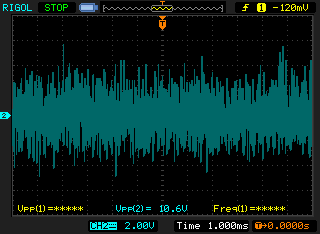 The 2N5172 transistors can be particularly noisy and Ray recommends a 10K resistor for R148. However for the two 2n5172’s I had I needed a value more in the 5K range so I do really recommend building this circuit to a) pick a good transistor and b) choose a resistor for R148 that lets you use the R150 trim pot to adjust the output signal to around 10V peak to peak, like this: