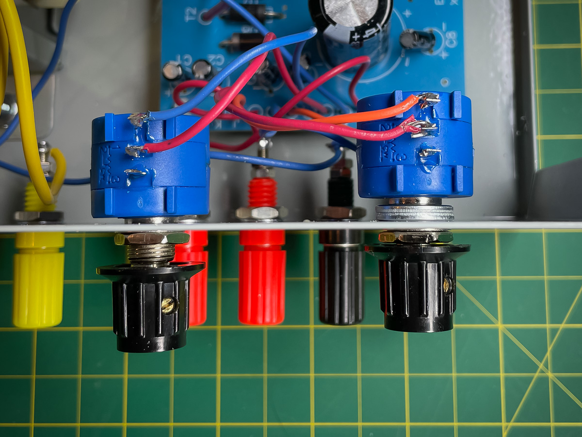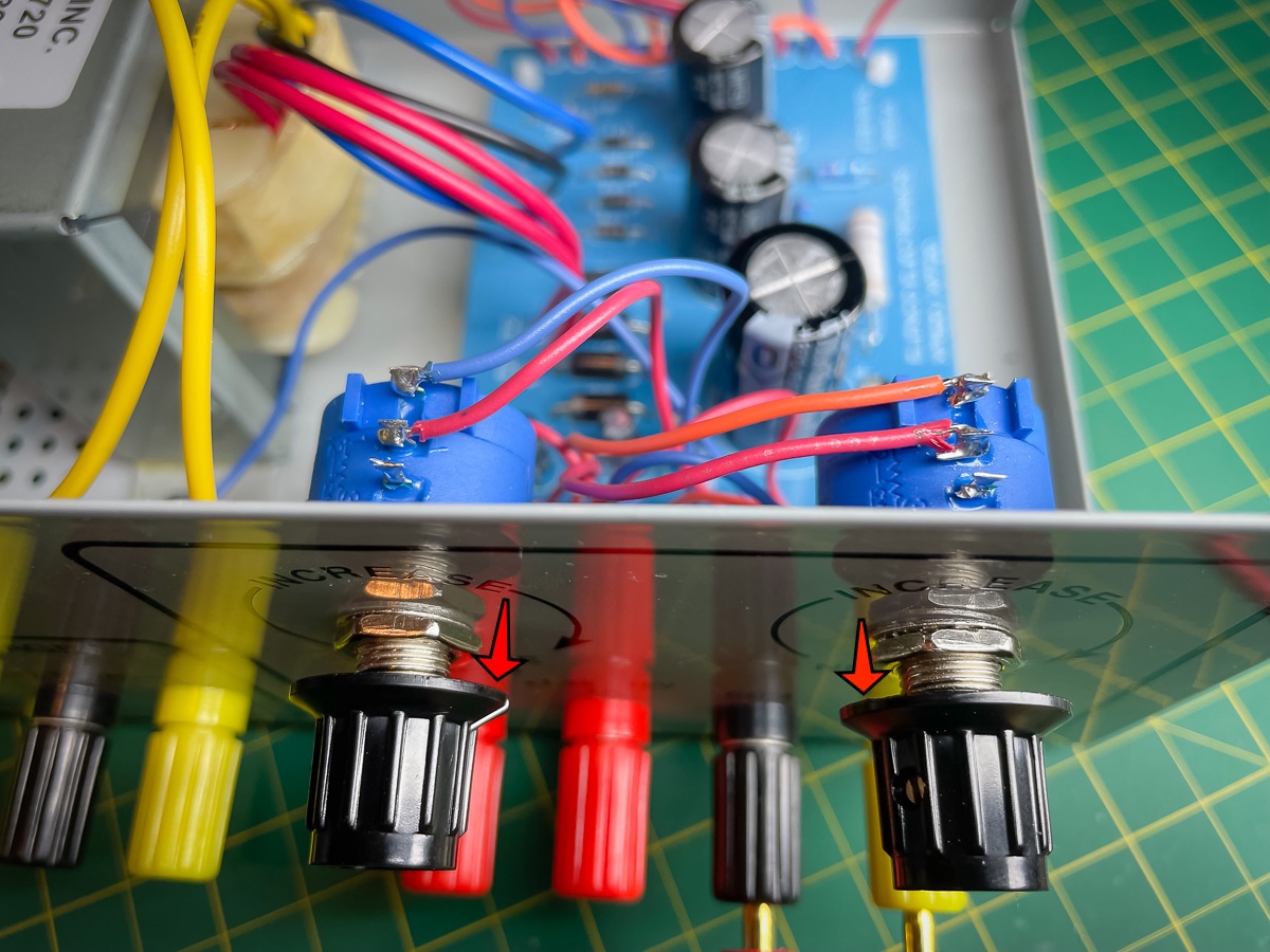 One of the recommended mods for Elenco’s XP-720 Power Supply is to replace the single-turn 2K potentiometers with equivalent multi-turn ones for finer control of the output voltages.