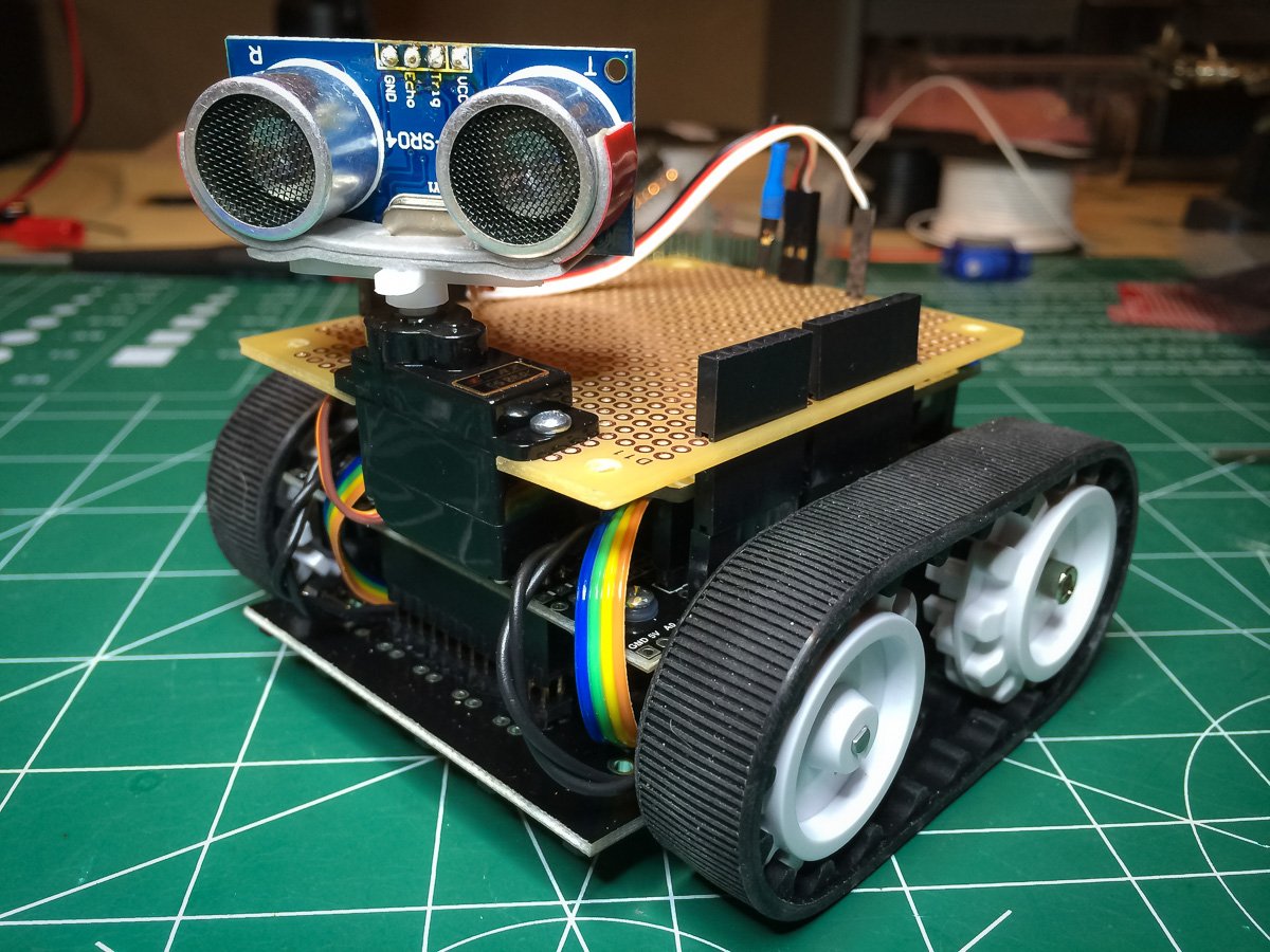 Added a perfboard with a mounted servo for a sweeping collision sensor.